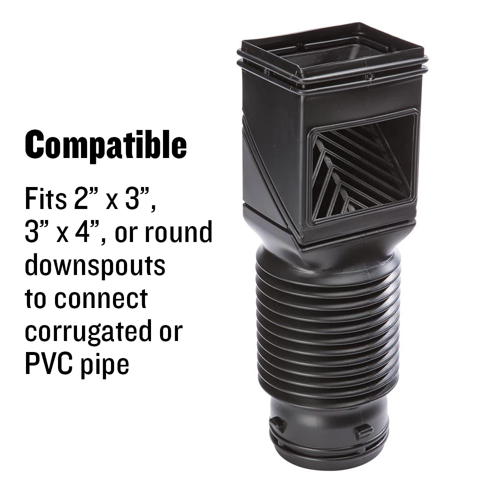 - Fits 2 in. x 3 in., 3 in. x 4 in. or round downspouts with a male type end to join with 4 in. corrugated or PVC pipe