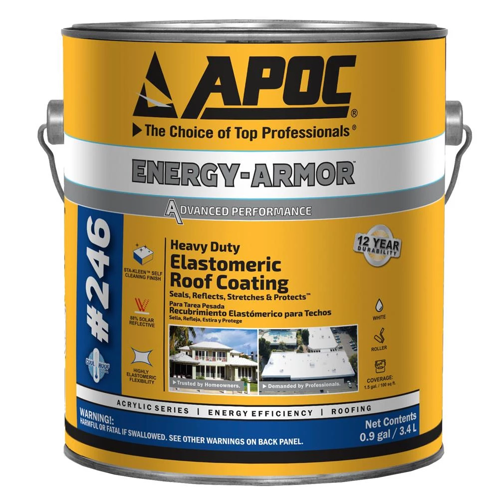 APOC #246 Energy-Armor Heavy Duty Elastomeric Roof Coating is a flexible, white acrylic roof coating. This product resists cracking and peeling while extending the life of the roofing substrate. It expands and contracts with the roofs movements to resist damage. This coating also provides a protective barrier which reflects the suns heat and destructive UV rays. In turn, this helps to cool surfaces and leads to a reduction of roof temperatures. APOC 246 expands and contracts up to 275% and provides good adhesion to a variety of roofing substrates.