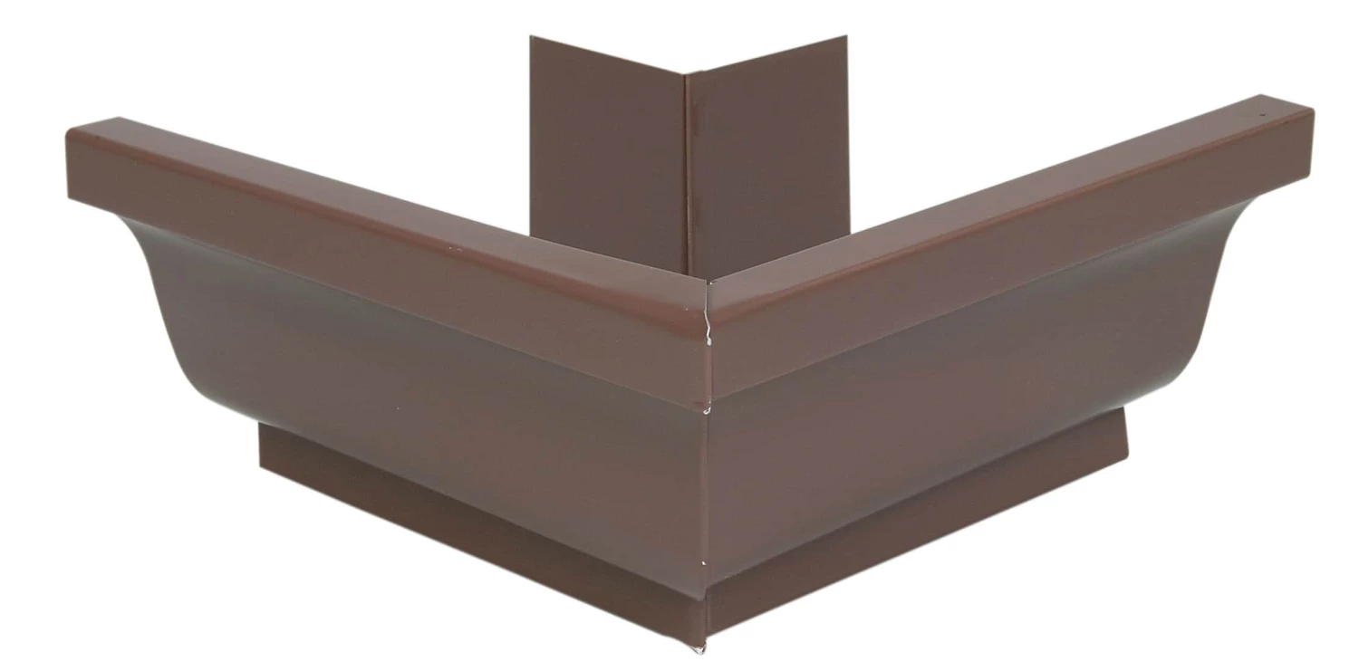 Factory baked on finish. An outside 5 In. brown aluminum mitre or corner provides two pieces of gutter to continue along an outside roof line or hip roof. This requires 2 Seamers or slip joints to make the connections.