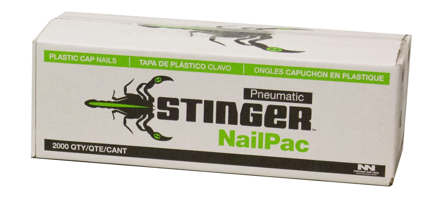The Stinger 1 in. Nail Pac contains 10 rolls of 200 collated plastic caps and 10 coils of 200 nails. NailPac contains 1 in. collated caps and 1 in. nails. Cap nails are a recommended best practice for securing roofing underlayments of felt and house wrap where nails are required. The 1 in. NailPac is for use with the Stinger CN100B Cap Nailer only.