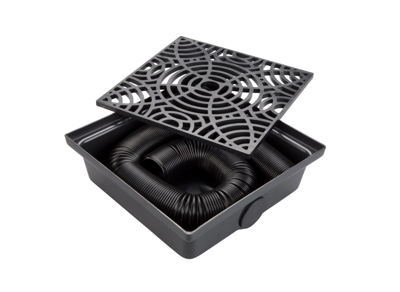 The Amerimax StealthDrain low profile catch basin allows you to move damaging rainwater away from your home with the look of a buried drainage system, without the cost. The low profile design creates an unobtrusive look and can be covered with mulch, straw or stones for a subtle appearance, with no digging required. Simply cut the included 8 ft. length of 2 in. pipe to your desired length, screw into the supplied drain holes, extend the pipe to direct the rainwater in your desired direction, and bury under mulch, stone, or pine straw. Be sure to utilize both drain holes when utilizing under a 3 in. x 4 in. downspout due to increased water volume.