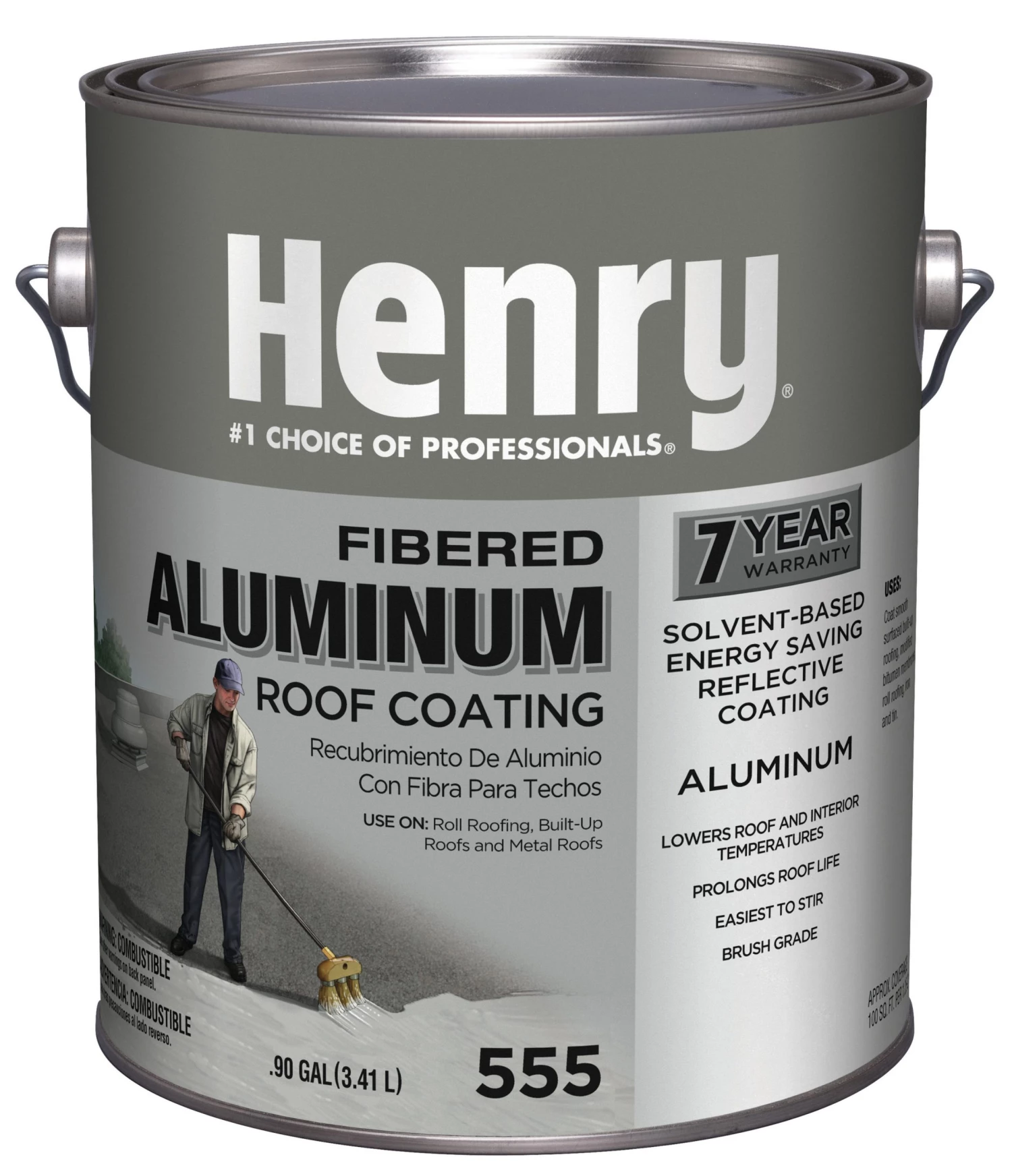 Henry 555 ultra grade, fibered aluminum, roof coating, 0.9 Gallon, energy saver formula, reduces interior temperatures by 20 degrees Fahrenheit, bright silver color stays bright longer, easiest to stir, excellent for agricultural buildings, solvent based reflective, fibered, asbestos free formula, not to be sold in southern California.