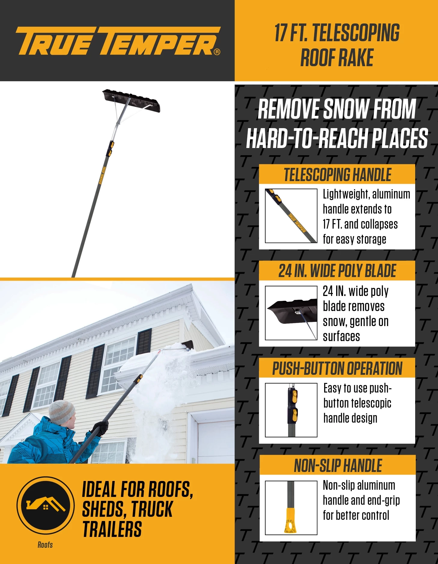 The True Temper Telescoping Roof Rake is the most innovative roof rake in years! The push-button, telescoping design makes it sleek and collapsible for easy storage. This snow roof rake can help prevent structural and water damage to your home that can result from heavy snow left on your home’s roof. It’s designed for strength and durability with lightweight aluminum and temperature resistant plastics. The handle enables a very long reach and it’s easier and safer to use than climbing up on your roof with a snow shovel.