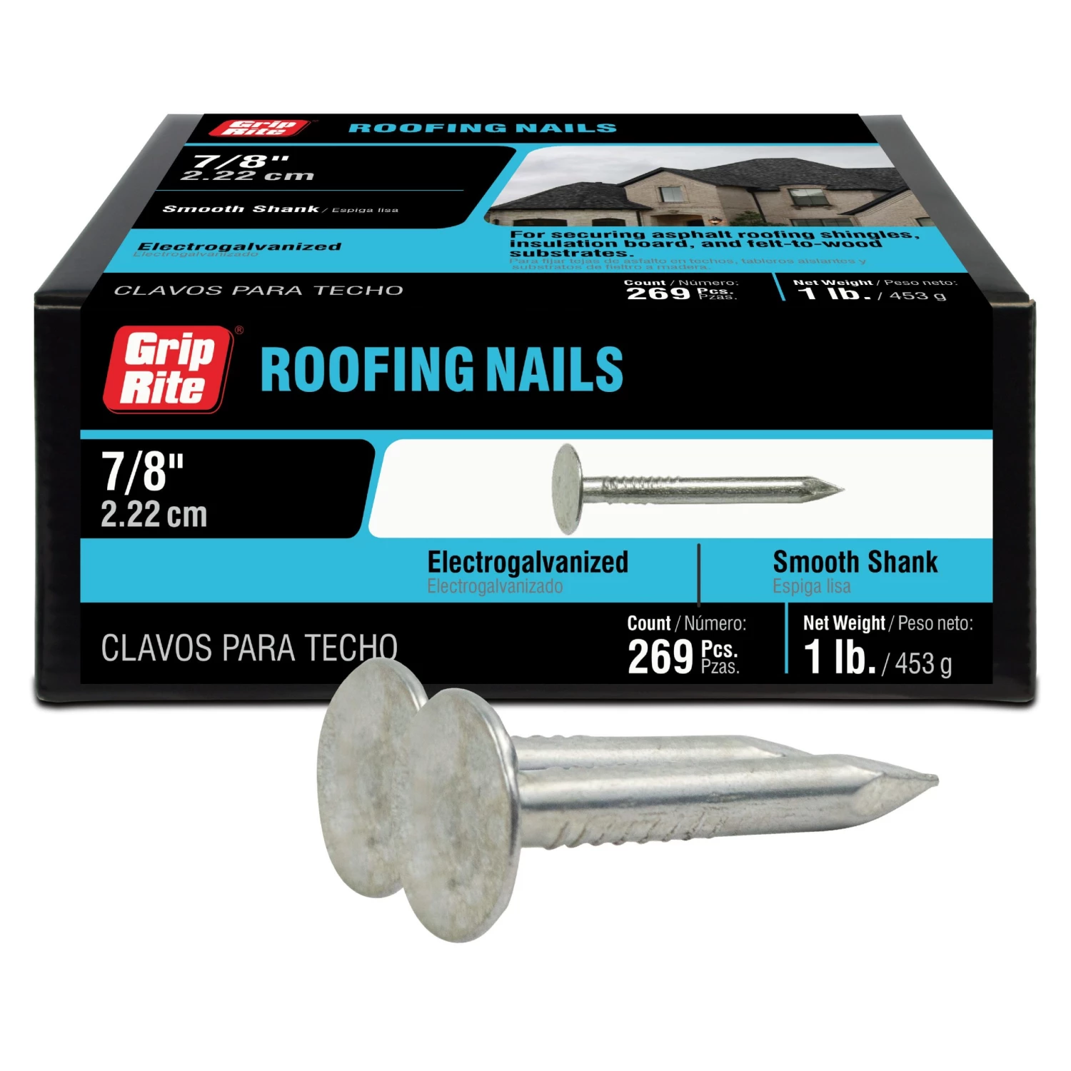 Grip-Rite fasteners are the choice of contractors who want professional results from a brand they know and trust. Grip-Rite galvanized roofing nails are used for applying asphalt shingles, insulation board, and felt to wood substrates. Roofing nails have a large head and thicker barbed shank to provide greater holding power. Roofing nails are also used to install vinyl siding as well.