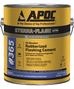APOC® 365 Eterna-Flash® All Weather/All Season Rubberized Flashing Cement is a high performance flashing cement specially formulated for the professional roofer. APOC® 365 is an extremely versatile modified mastic that provides superior adhesion to wet surfaces, easily bonds under water and is ideal for temporary or permanent repairs. APOC® 365 Eterna-Flash® is manufactured with select asphalt, synthetic rubber, solvent and fibers to provide an ‘E-Z Spread’ durable patching compound under the harshest weather conditions. APOC® 365 is the ultimate repair compound and can be used to repair splits, seams, cracks and holes in spudded gravel, mineral surfaced cap sheet, smooth surface asphalt roofs, most APP and SBS membranes and shingle roofs. It will seal areas around chimneys, vent pipes, gravel guards, down spouts, cracks in concrete and control joints on roofs. APOC® 365 is also an excellent utility mastic for use below grade in foundation damp-proofing systems.
